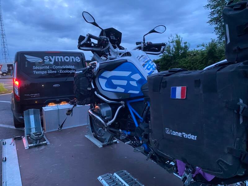 Pour ce faire, nous avons fait appel à "SYMONE", société Dijonnaise (ben oui tant qu'à faire, et comme d'hab, on joue le local), dont la spécialité est le transport de moto et de passager.