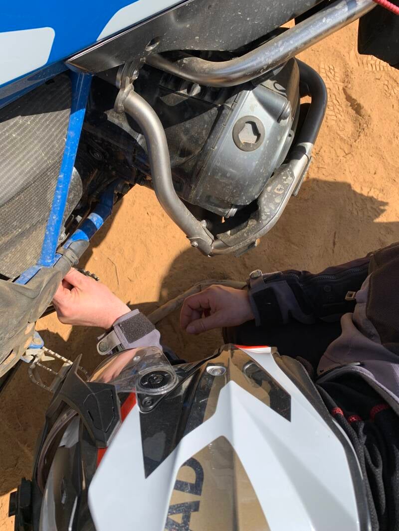 Mon attention s'échappe devant ce spectacle et me voila dans l'accotement, coté falaise évidement. l'accotement en question est rempli de poussière poussée sur les cotés et de débris de bois. je me dit que ca va mal finir mais non, merci madame GSA... je sors de la sans encombre mais je sens comme un truc bizarre, un truc qui freine. un morceau de bois a fait copain copain avec mon frein arrière. impossible de les séparer. rien de cassé, hormis un capuchon de câble qu'il faudra que je remplace à mon retour mais que nous avons pu remettre en place.